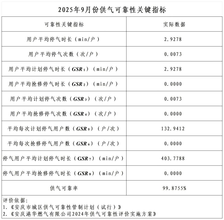 2025年9月份供氣可靠性關(guān)鍵指標(biāo)